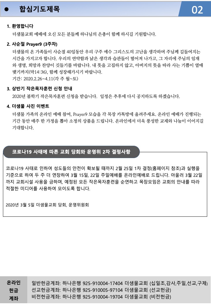 20.03.08 더샘물교회 주보 이 글 공유하기:Click to share on Twitter (새 창에서 열림)페이스북에 공유하려면 클릭하세요. (새 창에서 열림)이것이 좋아요:좋아하기 가져오는 중... 관련 관리자2020-03-07T17:16:59+09:00 관련 글 25.10.26 더샘물교회 주보 25.10.26 더샘물교회 주보 10월 25th, 2025 25.10.19 더샘물교회 주보 25.10.19 더샘물교회 주보 10월 17th, 2025 25.10.12 더샘물교회 주보 25.10.12 더샘물교회 주보 10월 10th, 2025 25.10.5 더샘물교회 주보 25.10.5 더샘물교회 주보 10월 3rd, 2025 25.9.28 더샘물교회 주보 25.9.28 더샘물교회 주보 9월 26th, 2025