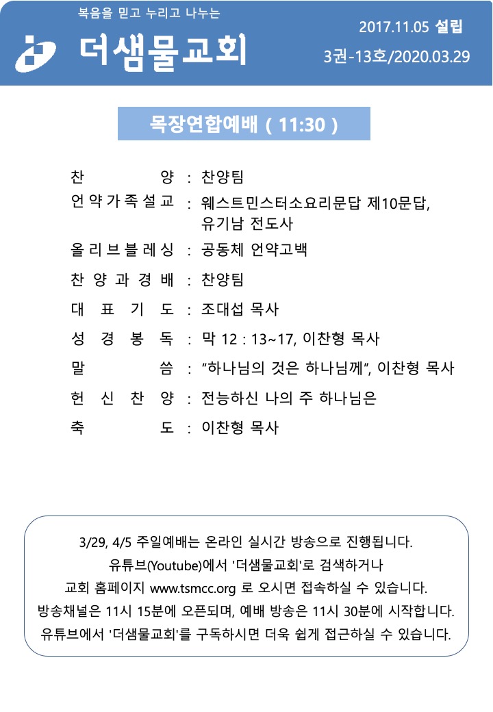 20.03.29 더샘물교회 주보 이 글 공유하기:Click to share on Twitter (새 창에서 열림)페이스북에 공유하려면 클릭하세요. (새 창에서 열림)이것이 좋아요:좋아하기 가져오는 중... 관련 관리자2020-03-28T10:06:47+09:00 관련 글 25.10.26 더샘물교회 주보 25.10.26 더샘물교회 주보 10월 25th, 2025 25.10.19 더샘물교회 주보 25.10.19 더샘물교회 주보 10월 17th, 2025 25.10.12 더샘물교회 주보 25.10.12 더샘물교회 주보 10월 10th, 2025 25.10.5 더샘물교회 주보 25.10.5 더샘물교회 주보 10월 3rd, 2025 25.9.28 더샘물교회 주보 25.9.28 더샘물교회 주보 9월 26th, 2025